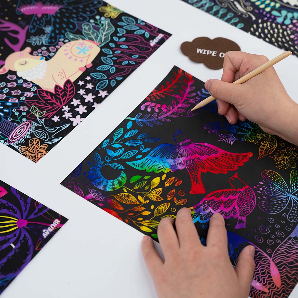 Use the scratcher tool provided to reveal rainbow colours. Slot your scene into the lightbox and turn on the LED lights to admire your beautiful designs.