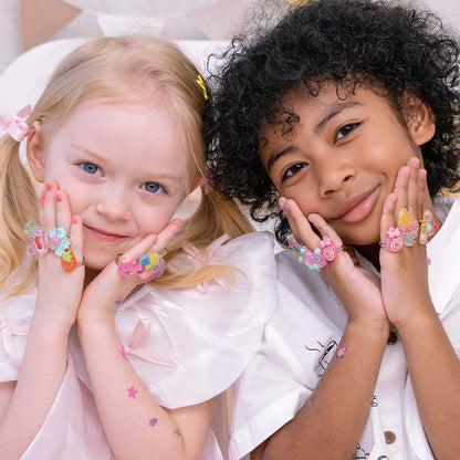 Sweet bling for everyone! This Yummy Yummy Sparkle Rings set features 7 charming sweet-themed rings including sparkling ice cream, candy, lollipop, and more. These aren't ordinary accessories - they are fun, flashy, and totally delicious-looking(but no eating allowed). Perfect for playdates, parties, or just felling fancy any day of the week!