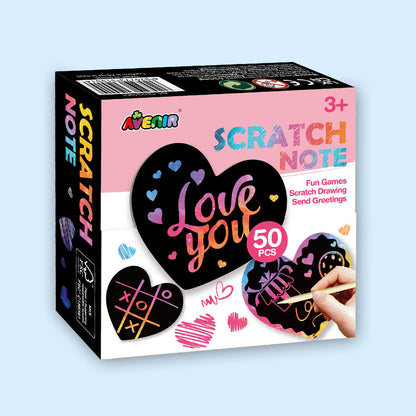 Each set includes 50 heart-shaped scratch notes that are sure to inspire imaginative projects. With bright and colorful designs hidden beneath a matte coating, little ones will love using the included wooden stylus to reveal vibrant colors and create unique doodles, heartfelt messages, and playful drawings.