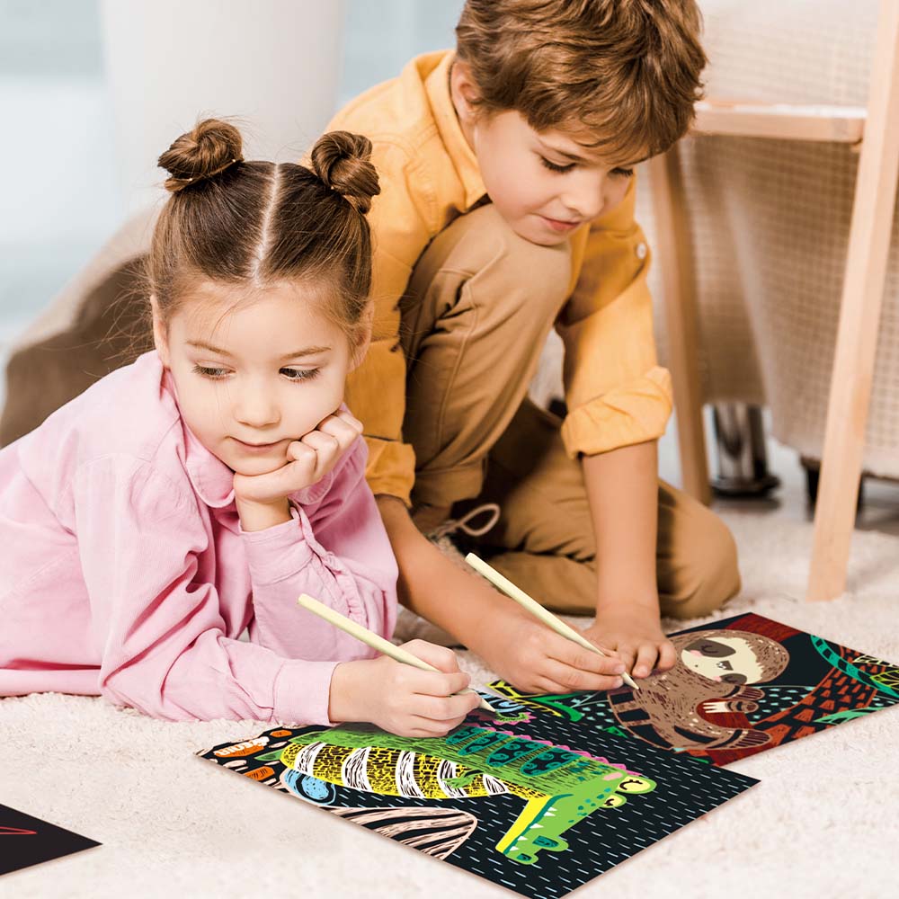 Avenir’s brightly coloured scratch art is perfect for keeping little ones entertained. The set includes 4 scratch sheets and a scratch pen. - High-quality double pack art kit - Scratch to reveal foil pictures—no drawing skills needed, but adding your own patterns is fun too - Comes with boards and scratch pens - Innovative design - Ideal gift for kids