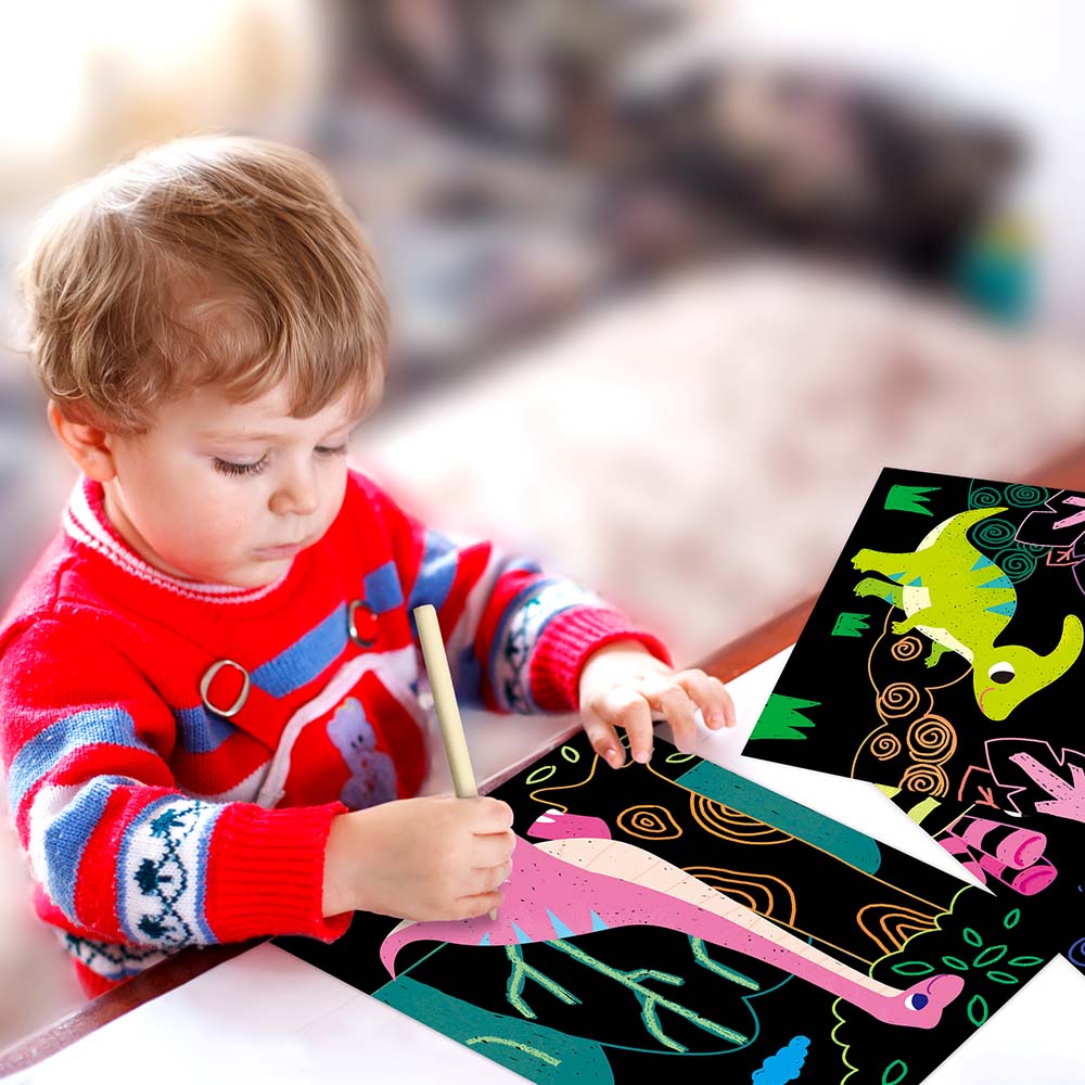 Create beautiful works of art with this Junior Scratch Art Set from Avenir. All you need to do is scratch away the black surface with the included scratch pen to uncover an amazing brightly coloured design. This engaging art set consists of eight different cards to scratch and reveal including various adorabl dinosaur friends.