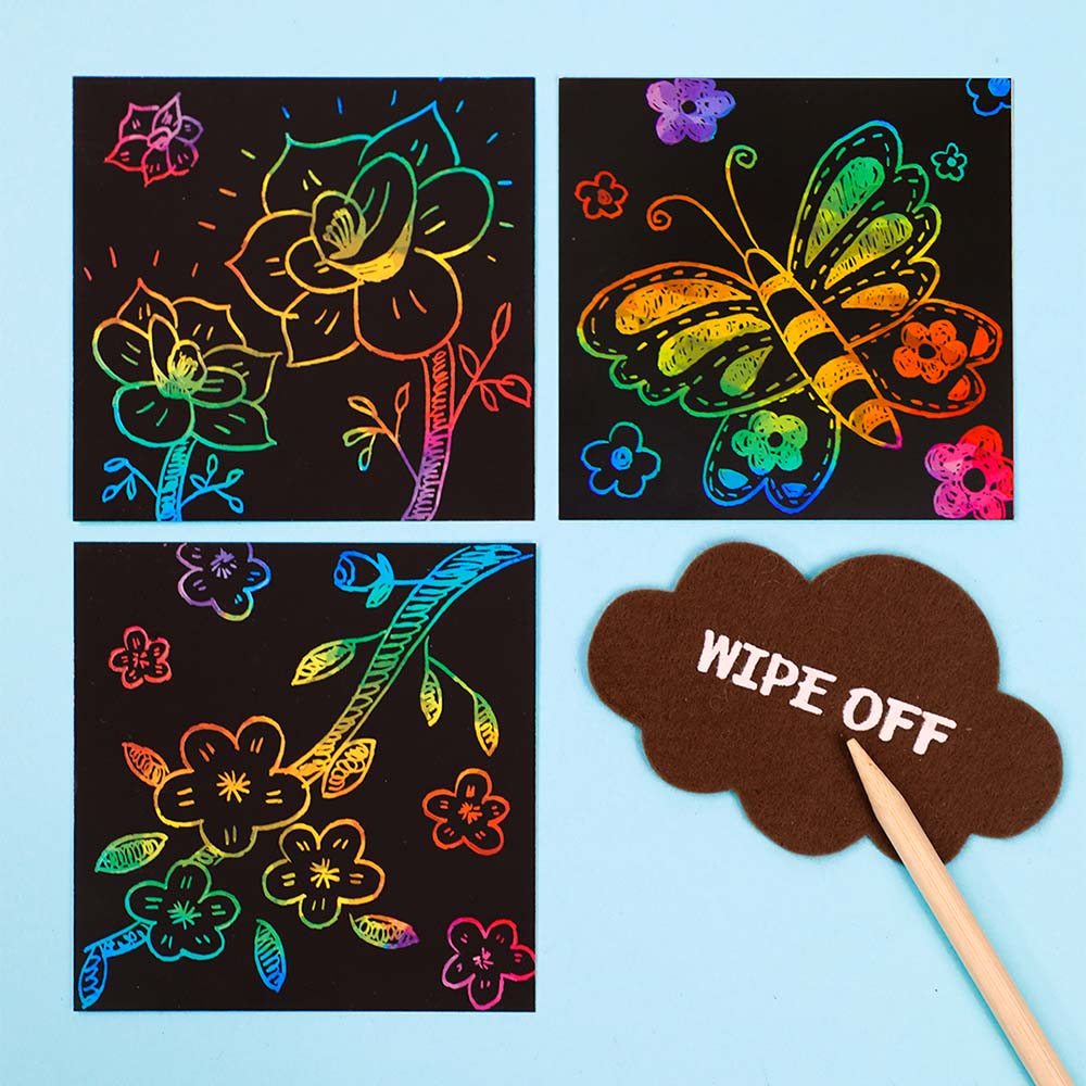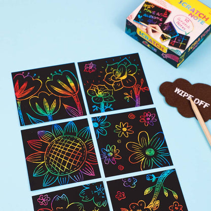 Each set includes 50 square-shaped scratch notes that are sure to inspire imaginative projects. With bright and colorful designs hidden beneath a matte coating, little ones will love using the included wooden stylus to reveal vibrant colors and create unique doodles, heartfelt messages, and playful drawings.